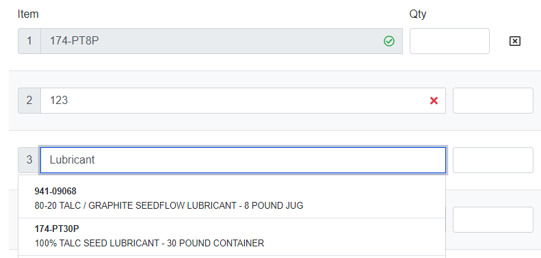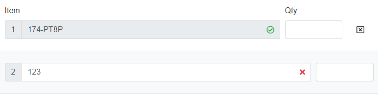 As you type in your part numbers, if you don't select a part number you'll see a red X. You can either remove what in the input, or select a part number and the red X will go away.