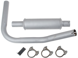 Vertical two-piece muffler and pipe with clamp. Custom design ready for assembly. Pipe inlet 1-5/8 inch I.D., outlet 1-3/4 inch O.D. For 134 CID gas engines. Tractors: NAA, 501, 600, 700, 2000 (4 cyl, 1953-1964). 172 CID gas engines. Tractors: 800, 900 (1955-1957), 4000 (4 cyl, 1958-1964).